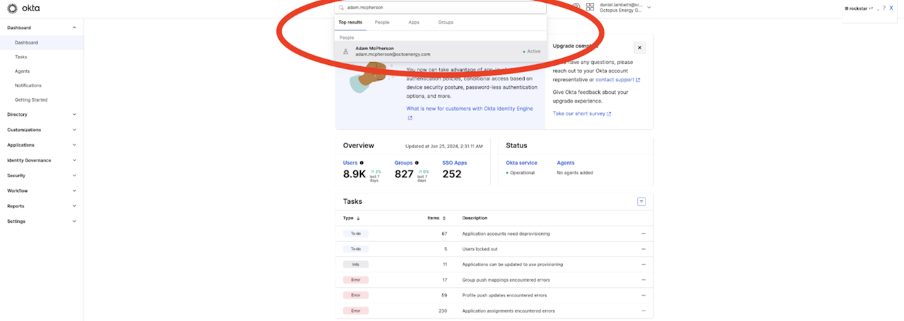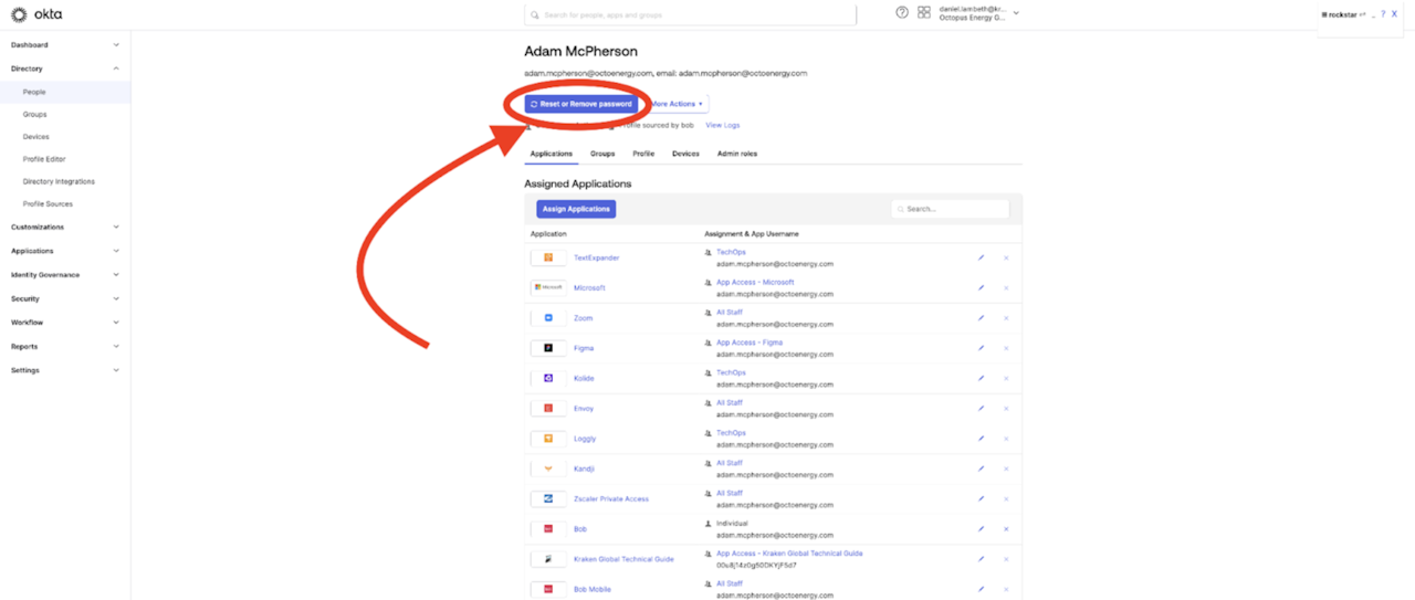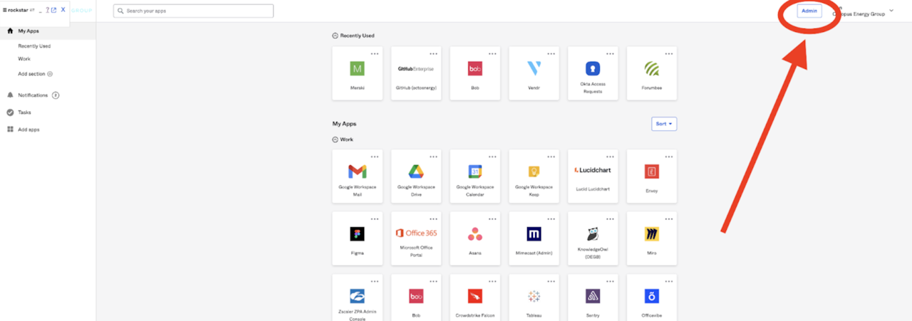 Go to https://octoenergy.okta.com and select Admin in the top right corner.